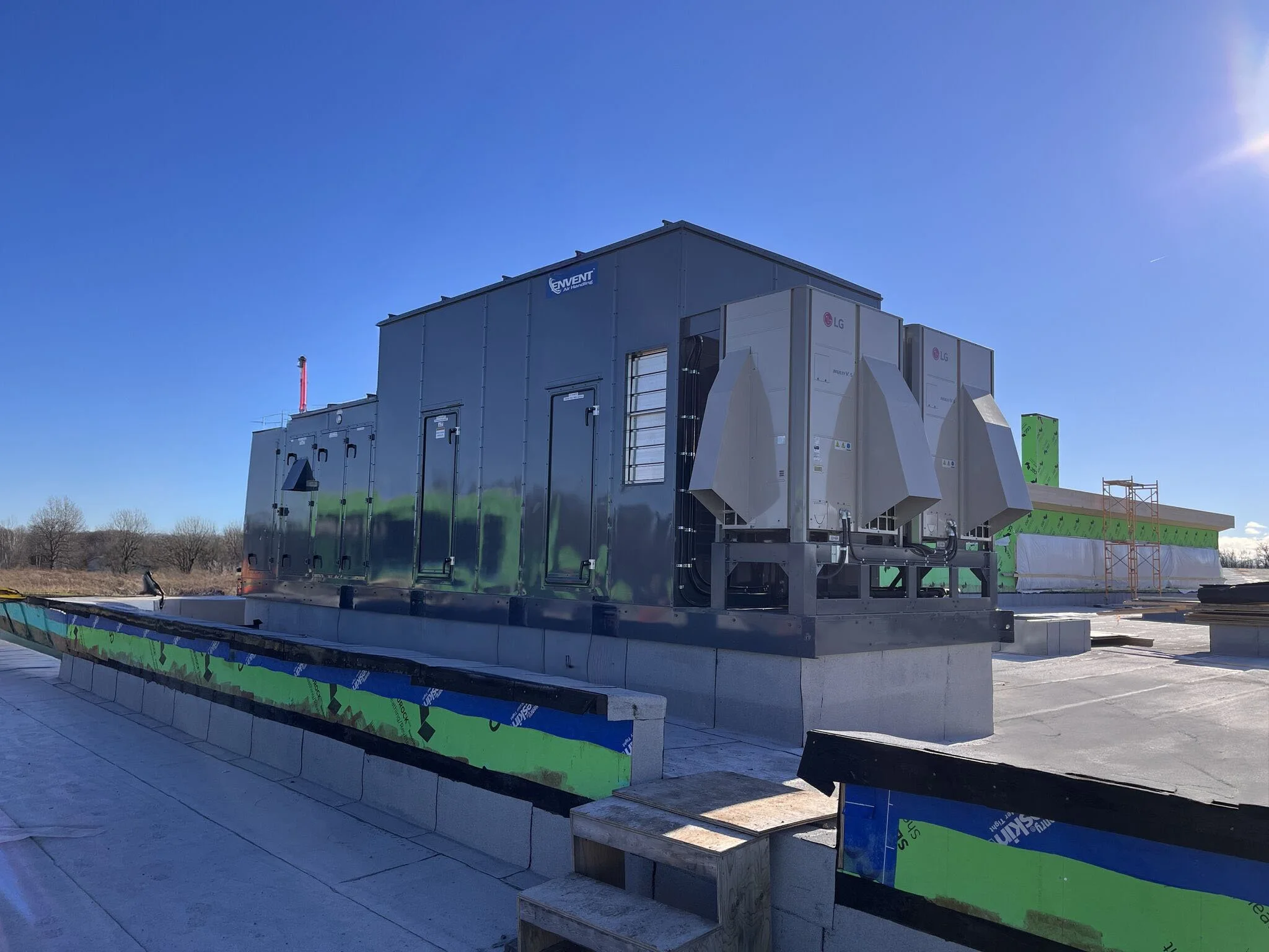 Delivered fully assembled, the VRF enabled air handler requires just one lift and minimal field labor. No separate components, no field integration, no field refrigerant piping. The entire system—VRF condensing units, controls, and Envent air handler—is powered through a single electrical connection, reducing labor costs and installation time.